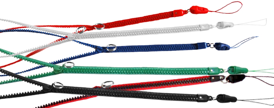 Cinta cuello, lanyard, Zipper con argolla (es posible anadir puller personalizado) y clic-clac con hilo